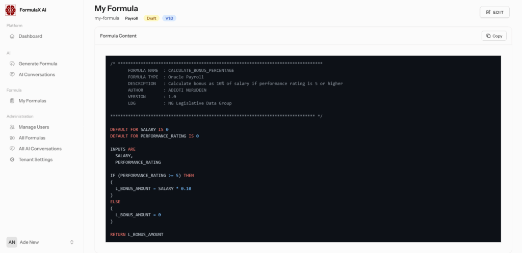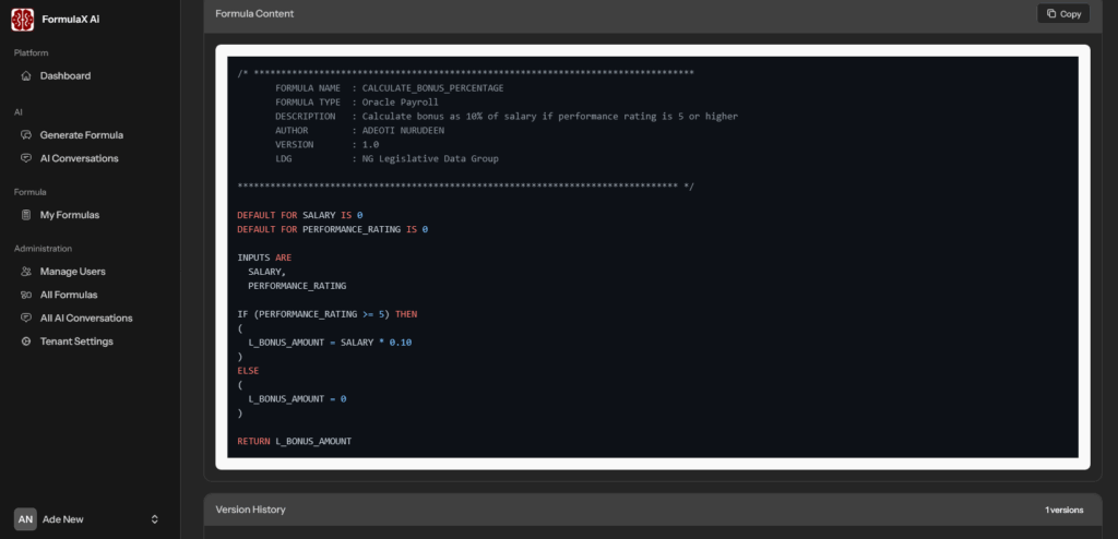 FormulaXCloud has completely transformed the way we handle Oracle HCM formulas. What used to take hours of coding and troubleshooting now only takes a few minutes. I just describe what I need in plain English, and the platform generates a ready-to-deploy formula instantly. It’s accurate, fast, and has saved our team countless hours. FormulaXCloud is truly a game-changer for Oracle HCM users.